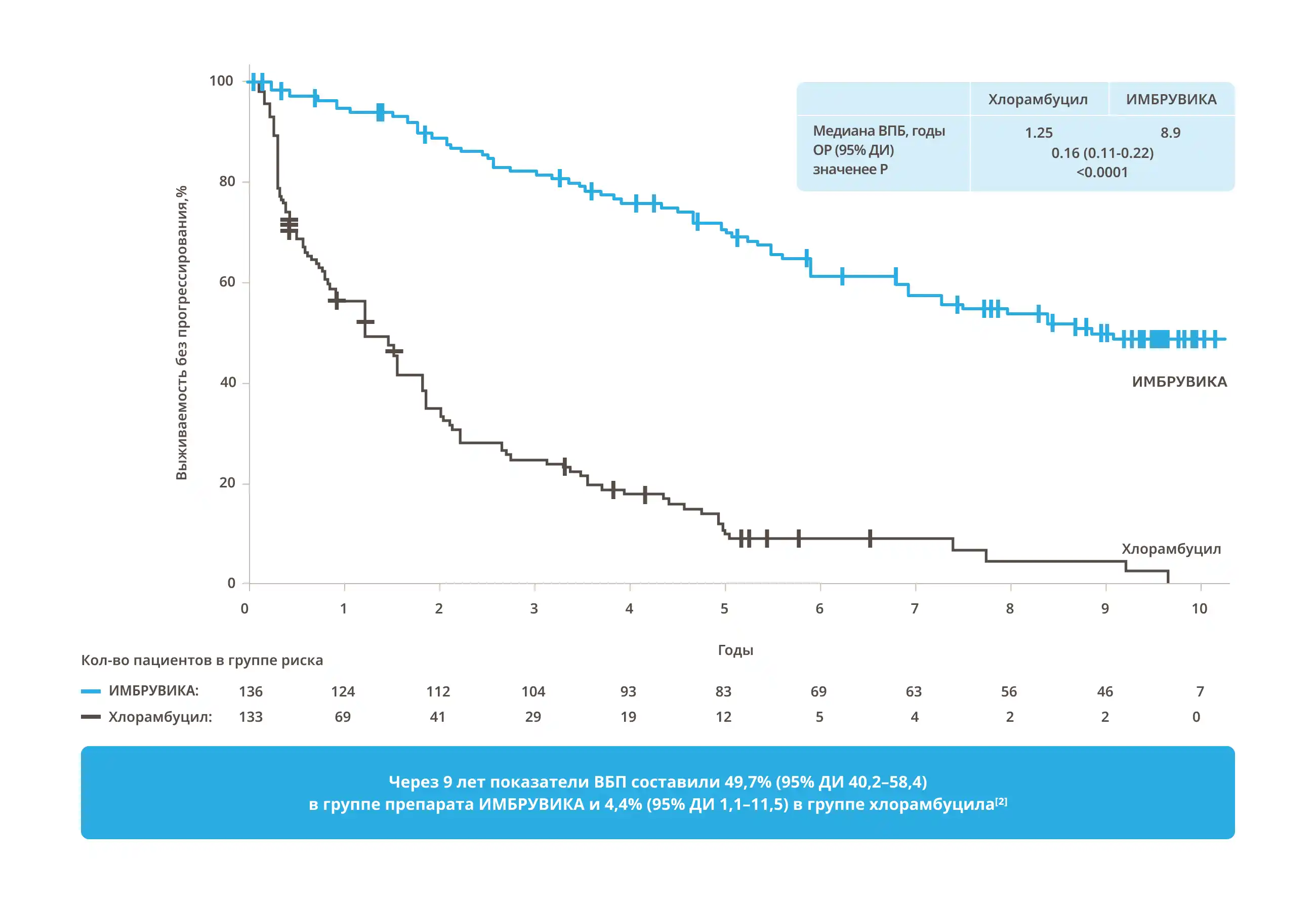 Препарат ИМБРУВИКА значимо увеличивает ВБП у пациентов с ХЛЛ по сравнению с терапией Clb2