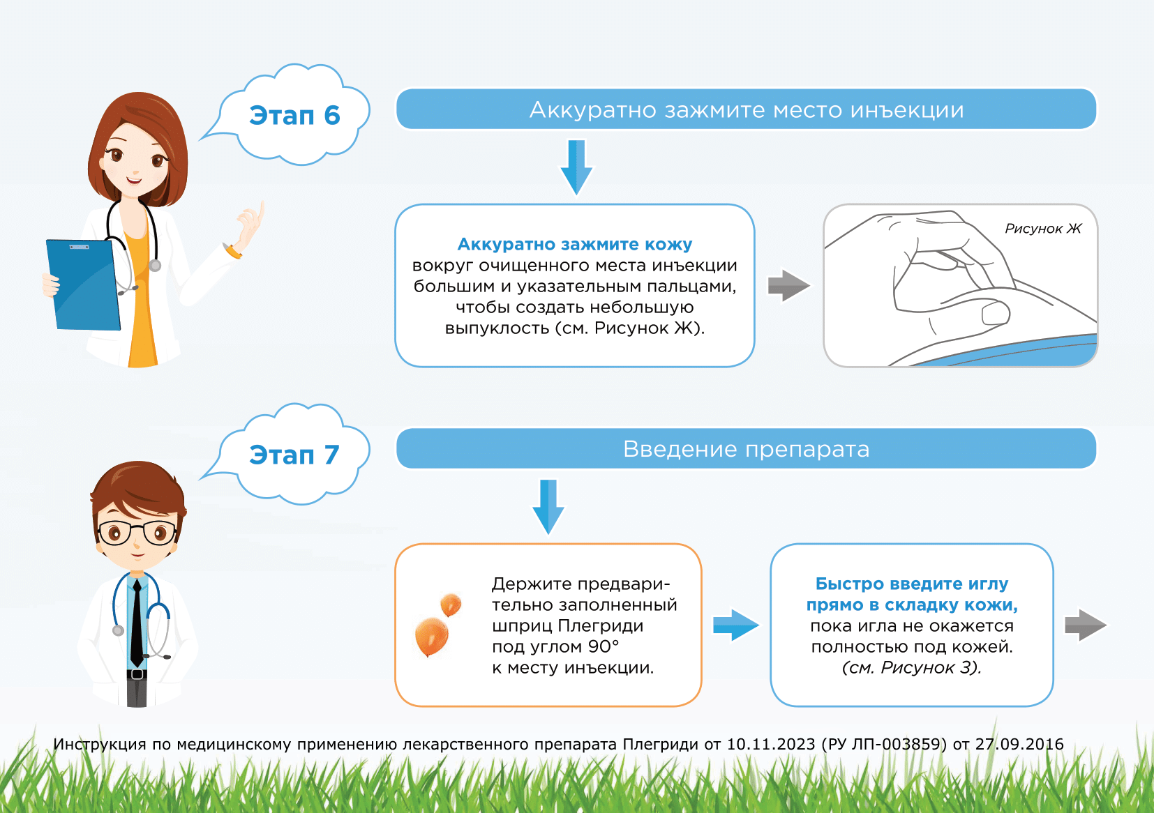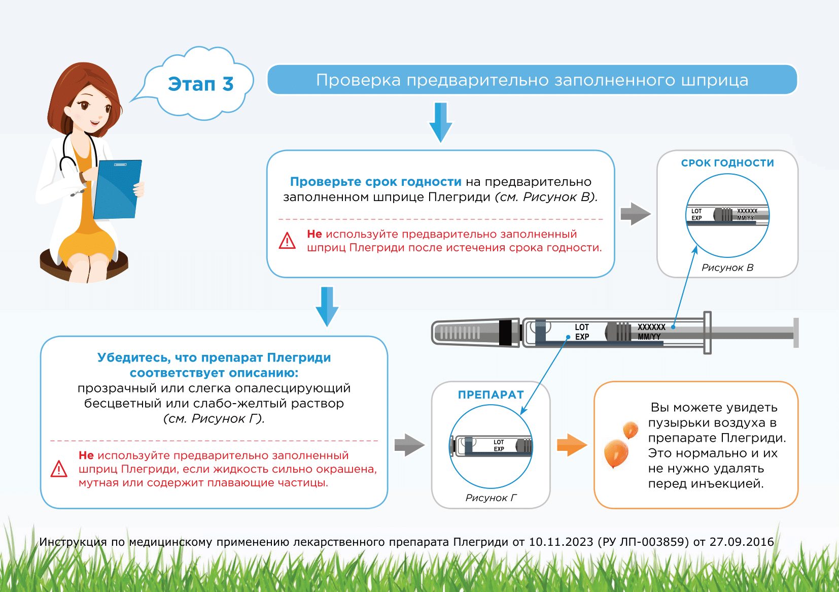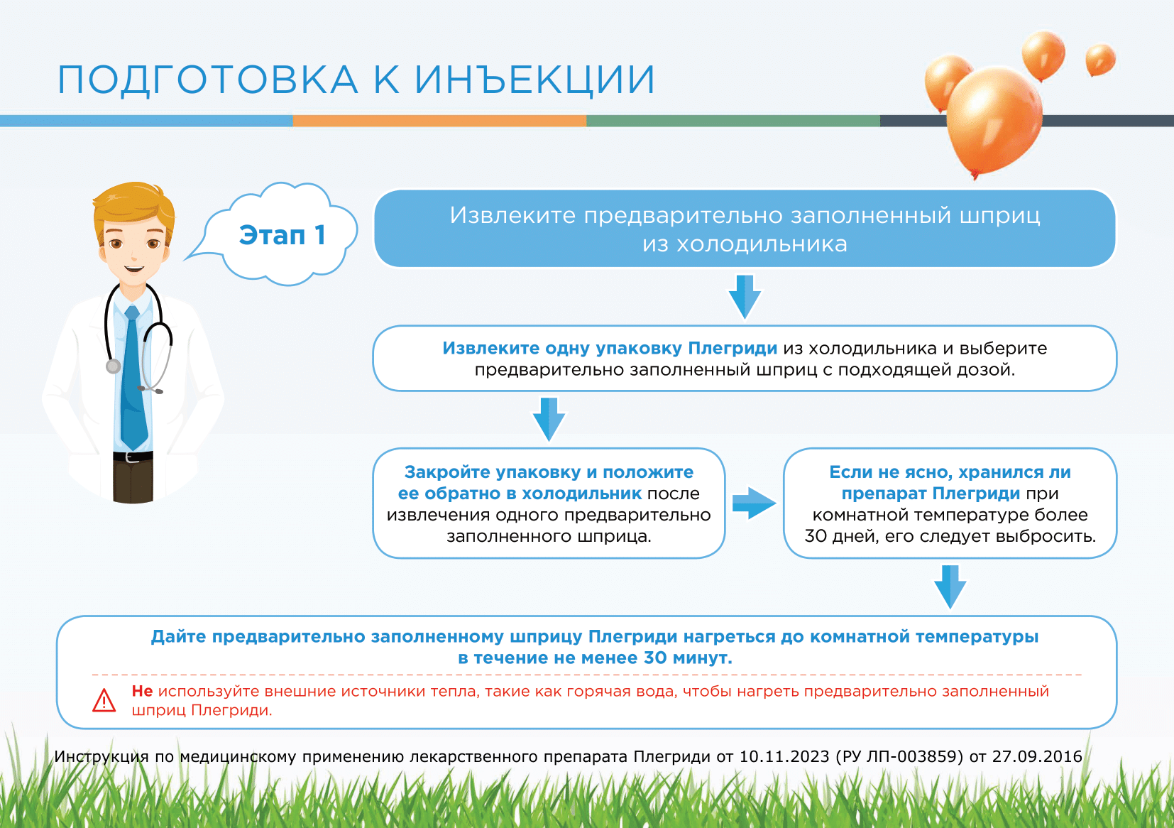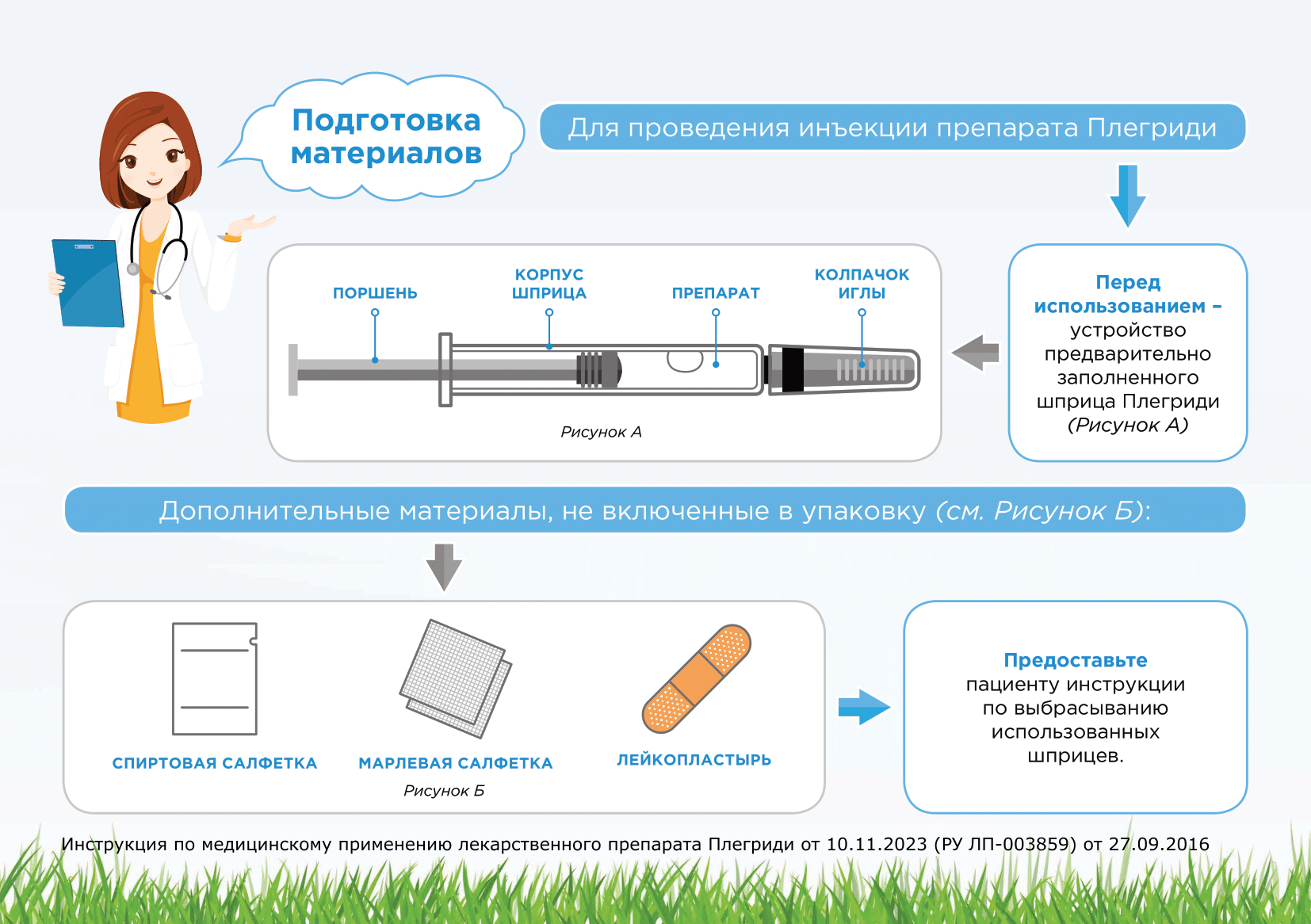- Перед первым применением предварительно заполненного шприца Плегриди, вы (врач или медсестра) должны показать пациенту или человеку, который ухаживает за ним, как подготовить и ввести препарат Плегриди.