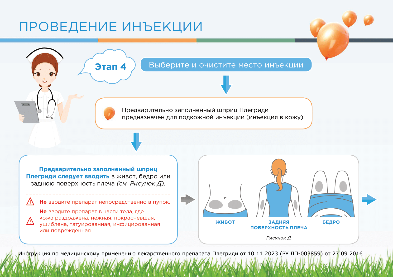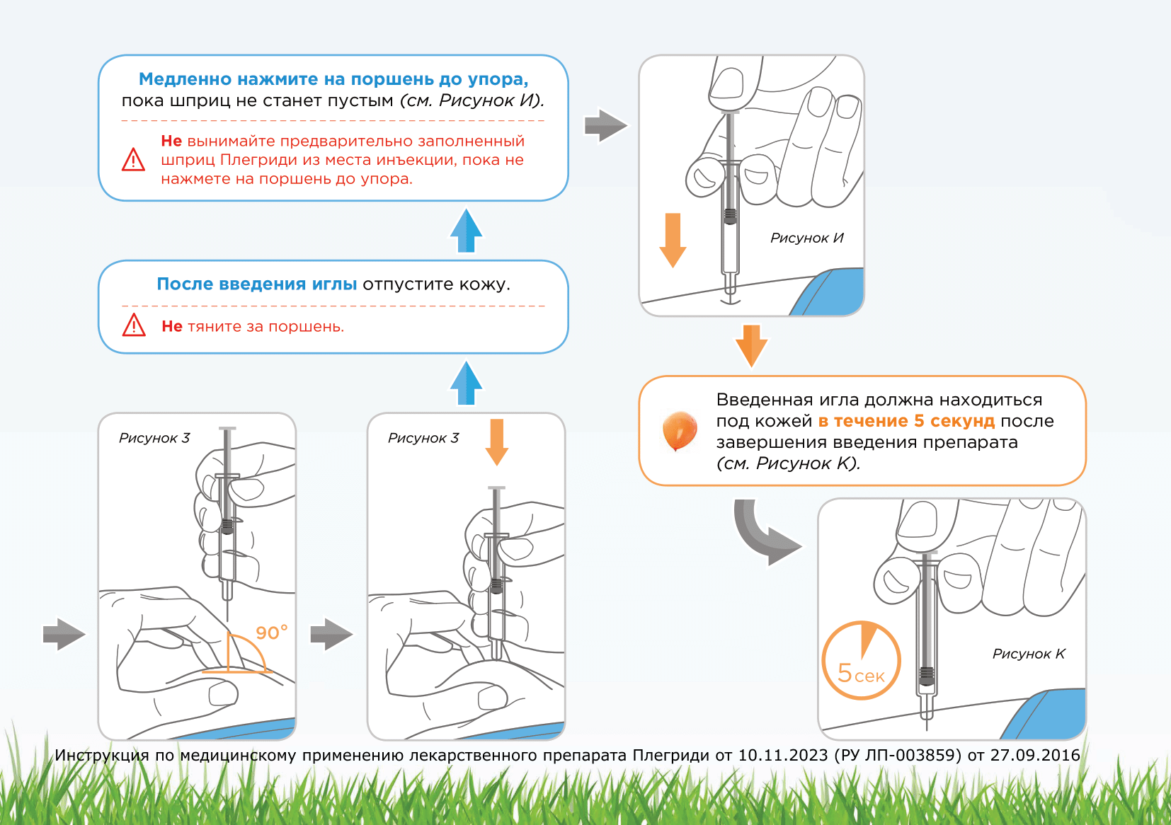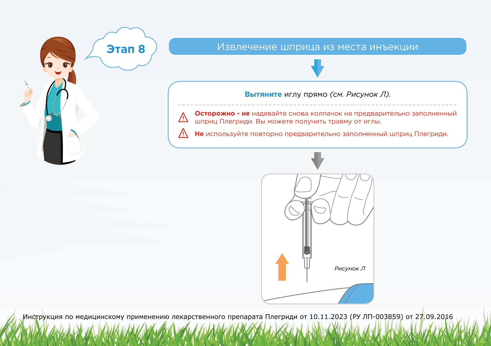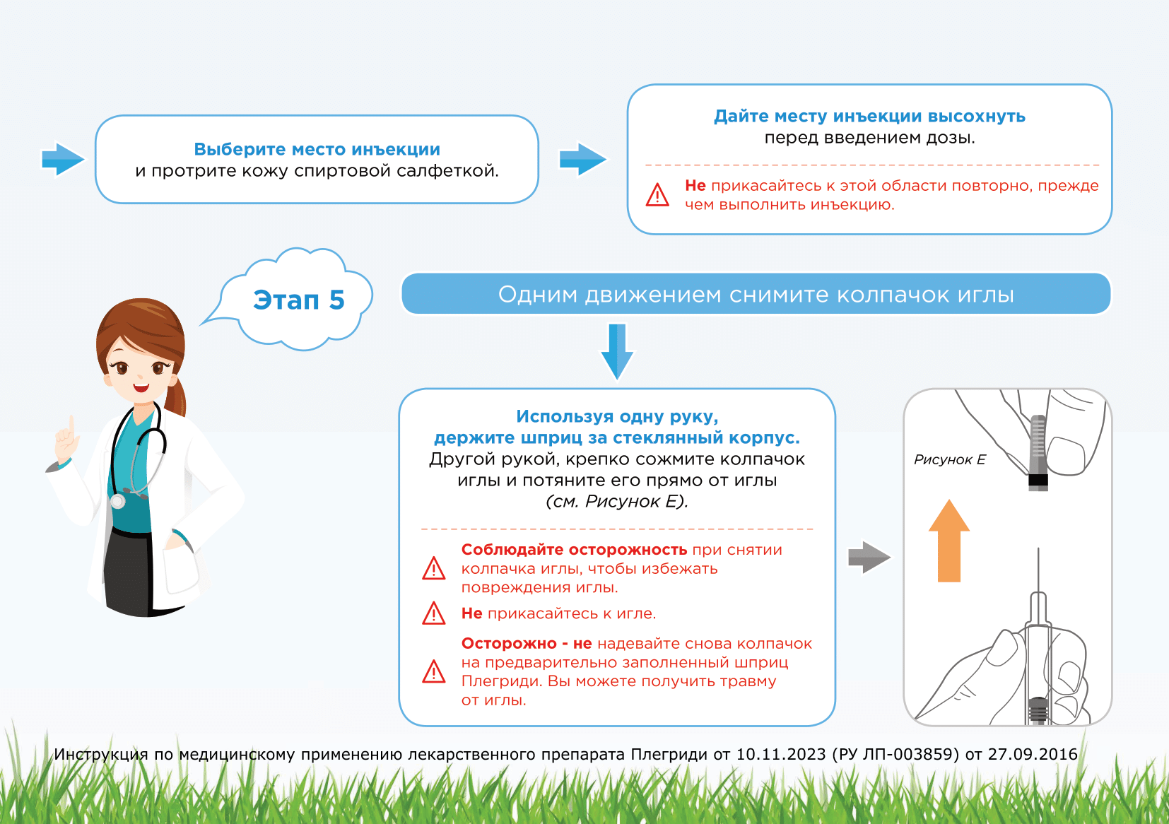 - Перед первым применением предварительно заполненного шприца Плегриди, вы (врач или медсестра) должны показать пациенту или человеку, который ухаживает за ним, как подготовить и ввести препарат Плегриди.