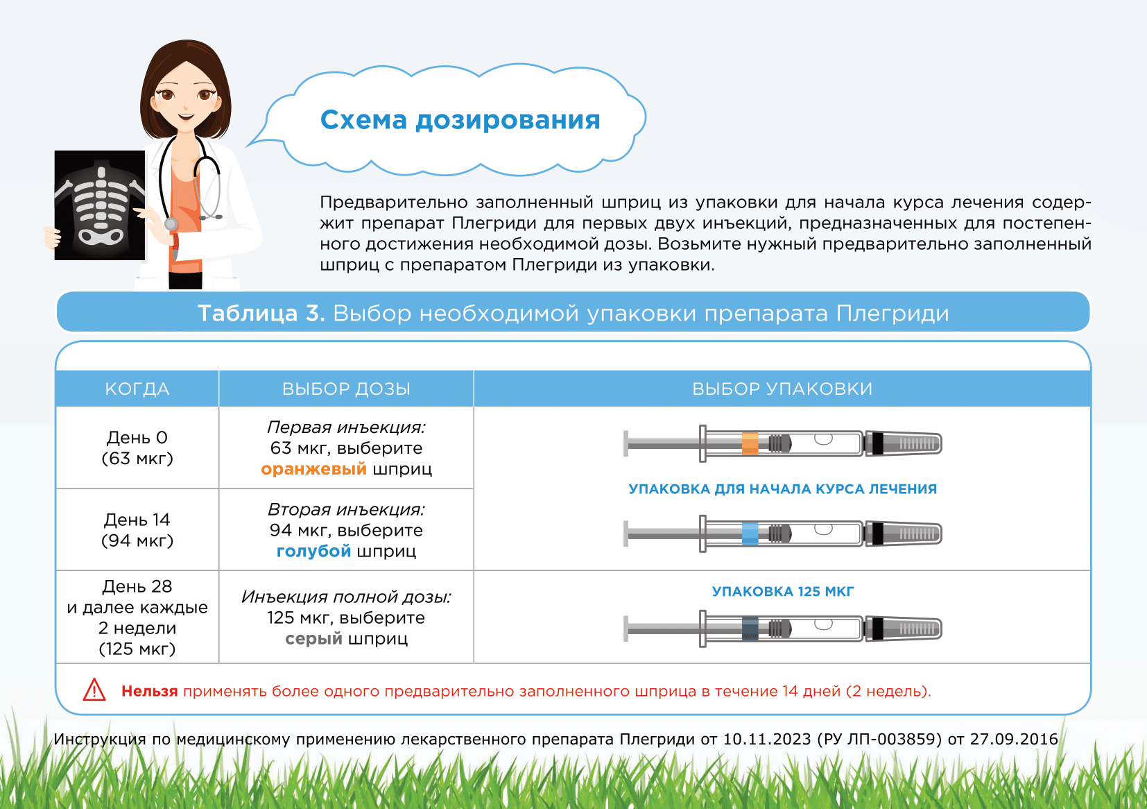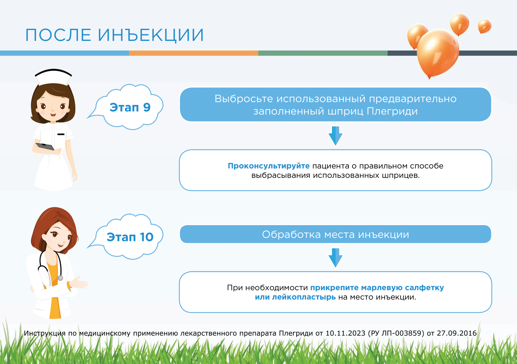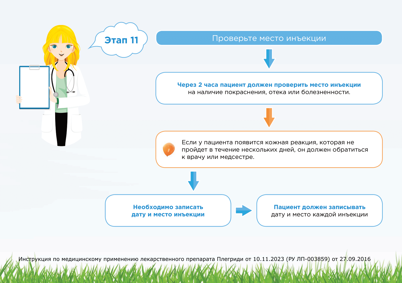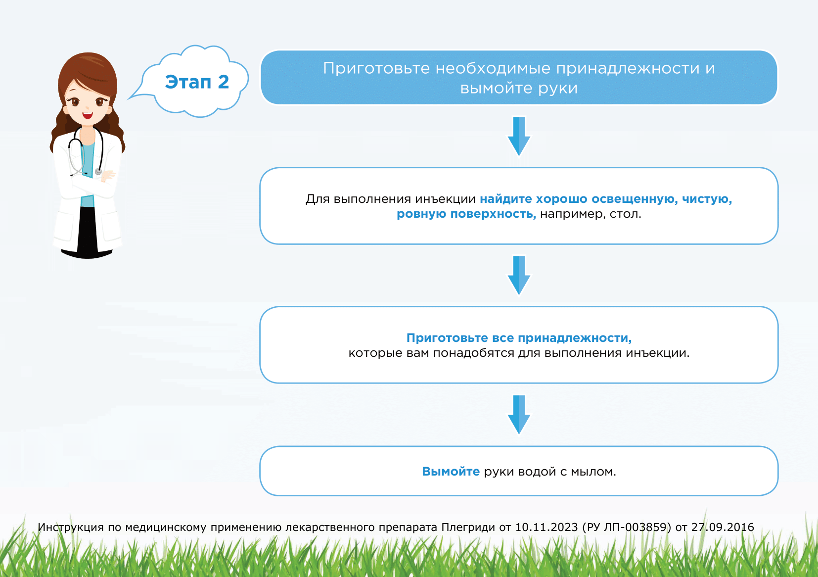 - Перед первым применением предварительно заполненного шприца Плегриди, вы (врач или медсестра) должны показать пациенту или человеку, который ухаживает за ним, как подготовить и ввести препарат Плегриди.