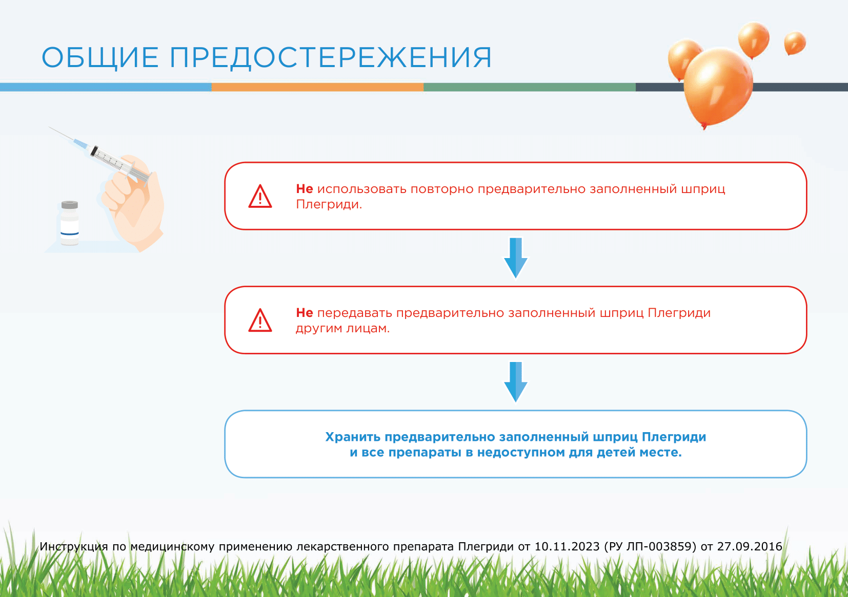 - Никому нельзя передавать предварительно заполненный шприц Плегриди, чтобы предотвратить возможность инфицирования.